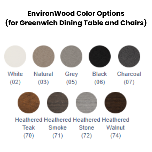 All pieces are manufactured from EnvironWood and connected with hidden marine-grade stainless steel fasteners. EnvironWood is a 100% High Density Polyethylene (HDPE) lumber. Made from recycled plastic bottles and containers, Envirowood is permeated with UV stabilized pigments that are consistent throughout the entire piece. The result is a smoother and more durable finish that prevents chalking and resists fading of the surface. These products are designed to last through harsh outdoor conditions, leading to the manufacturer's warranties of up to 20 years.